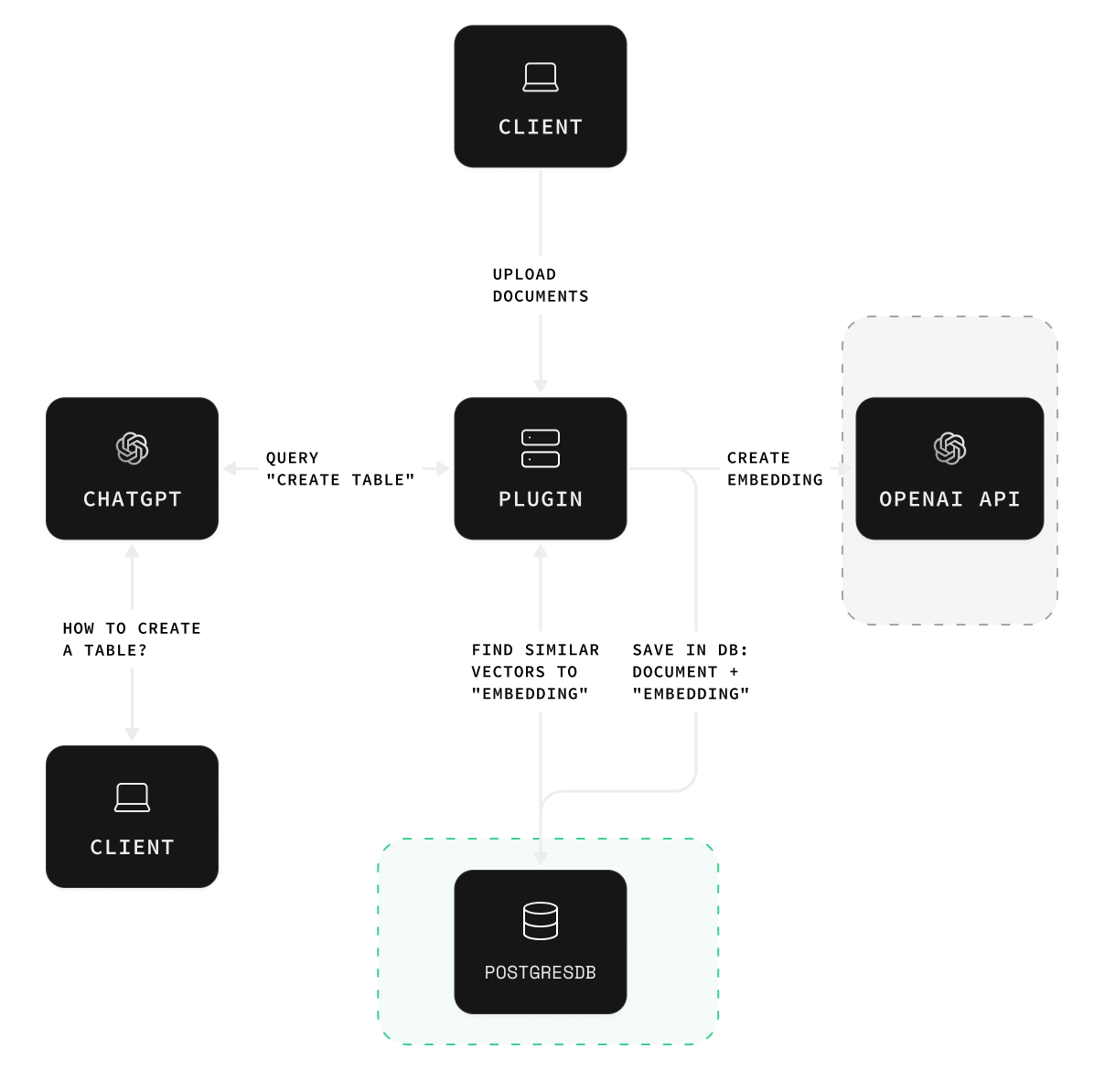 We'll be saving the Postgres documentation in Postgres, and ChatGPT will be retrieving the documentation whenever a user asks a question: