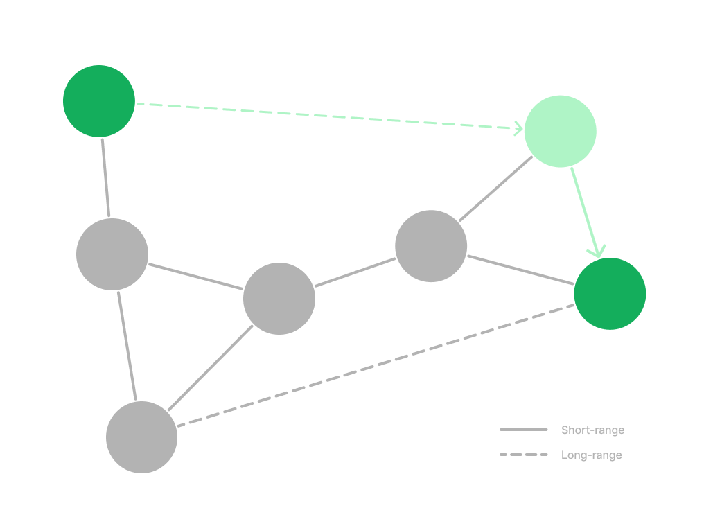 HNSW combines these two concepts. From the hierarchical perspective, the bottom layer consists of a NSW made up of short links between nodes. Each layer above “skips” elements and creates longer links between nodes further away from each other.